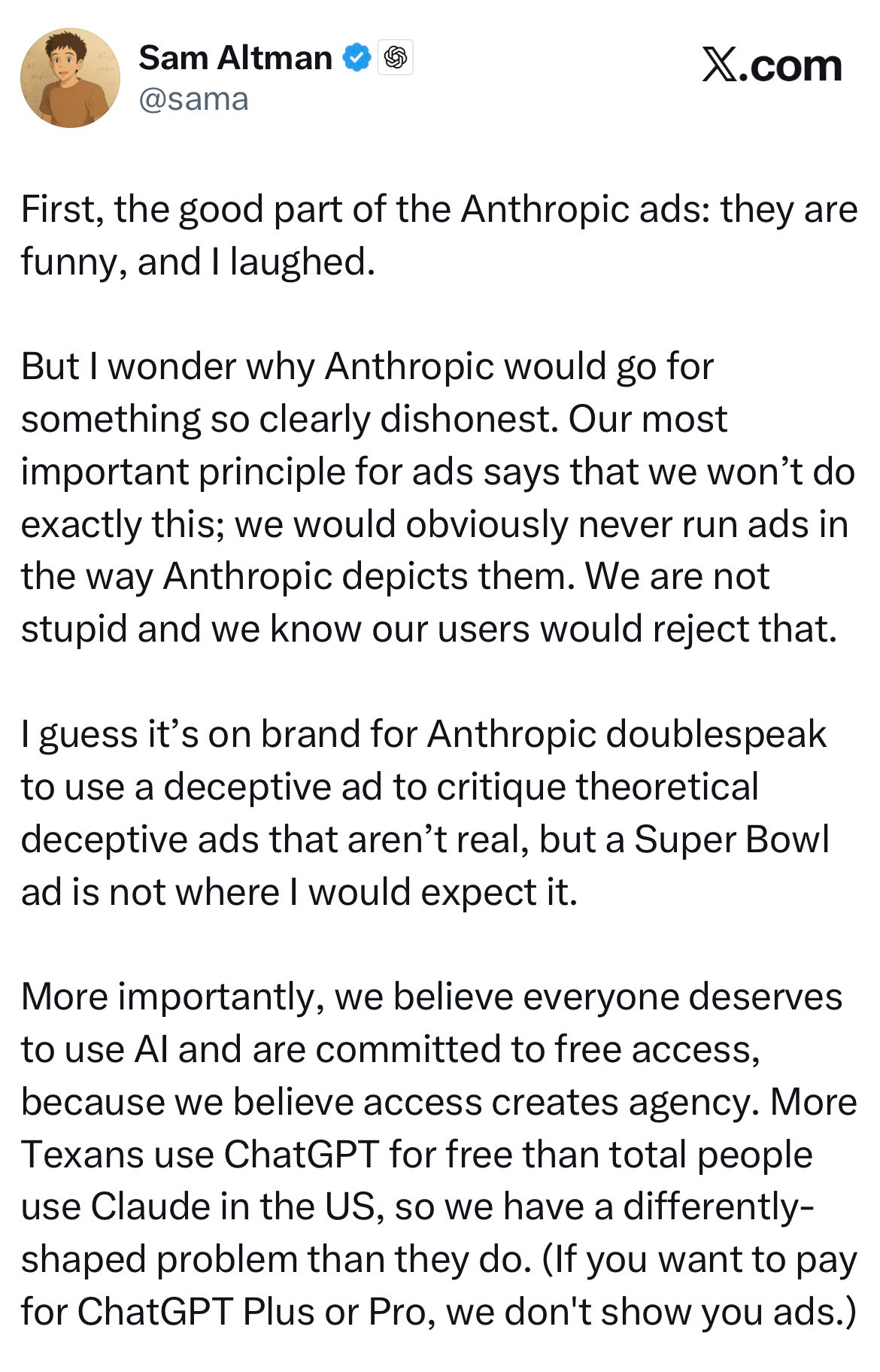 Come leggerete in questo nuovo episodio di Road To The Future, OpenAI ha fissato una serie di paletti, all’apparenza piuttosto solidi, ma – parliamoci chiaro - la possibilità di integrare (in futuro) gli annunci direttamente all’interno delle conversazioni di ChatGPT (che, poi, è il tema portante dei chiacchierati spot di Anthropic), è una occasione troppo ghiotta per farsela scappare.